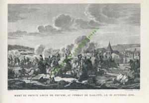 BATAILLES DU CONSULAT ET DE L’EMPIRE.MORT DU PRINCE LOUIS DE PRUSSE, AU COMBAT DE SAALFELD, LE 10 OCTOBRE 1806. Grande gravure représentant Napoléon avec ses troupes, entrant dans Vienne, juste avant Austerlitz. Tirage du Second-Empire ; 380 X 250 mm sur un feuillet de 490 X 335 mm. Gravée par Pigeot d’après Swebach. Tirée de...