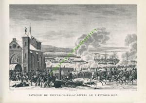 BATAILLES DU CONSULAT ET DE L’EMPIRE.BATAILLE DE PREUSSICH-EYLAU, LIVRÉE LE 9 FÉVRIER 1807. Grande gravure représentant Napoléon au milieu de ses troupes sur le champ de bataille. Tirage du Second-Empire ; 380 X 255 mm sur un feuillet de 490 X 335 mm. Gravée par Bovinet d’après Swebach. Tirée de l’Album des Campagnes des...