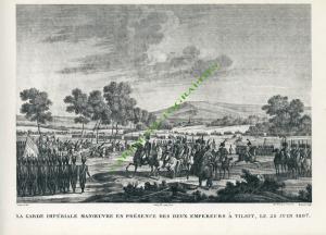 BATAILLES DU CONSULAT ET DE L’EMPIRE.LA GARDE IMPÉRIALE MANŒUVRE EN PRÉSENCE DES DEUX EMPEREURS À TILSIT, LE 28 JUIN 1807. Grande gravure représentant Napoléon et Alexandre au milieu des troupes. Tirage du Second-Empire ; 380 X 255 mm sur un feuillet de 490 X 335 mm. Gravée par Bovinet d’après Swebach. Tirée de l’Album...