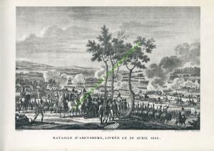 BATAILLES DU CONSULAT ET DE L’EMPIRE.BATAILLE D’ABENSBERG, LIVRÉE LE 20 AVRIL 1809. Grande gravure représentant une Napoléon sur le champ de bataille. Tirage du Second-Empire ; 375 X 252 mm sur un feuillet de 490 X 335 mm. Gravée par Bovinet d’après Swebach. Tirée de l’Album des Campagnes des Français sous le Consulat et...