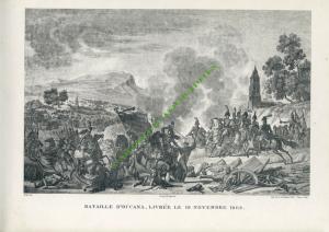BATAILLES DU CONSULAT ET DE L’EMPIRE.BATAILLE D’OCCANA, LIVRÉE LE 19 NOVEMBRE 1809. Grande gravure représentant une scène de la bataille. Tirage du Second-Empire ; 380 X 248 mm sur un feuillet de 490 X 335 mm. Gravée par Pigeot d’après Roéhn. Tirée de l’Album des Campagnes des Français sous le Consulat et l’Empire...