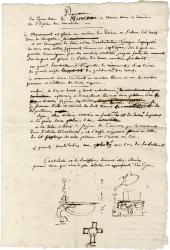 INGRES Jean Auguste DominiqueManuscrit autographe signé « I » avec 3 dessins, Programme du Tombeau de NAPOLÉON à élever dans le dôme de l'Église des Invalides, [décembre 1840] ; 1 page in-folio. Pièce très importante concernant le futur tombeau de l'Empereur Napoléon, comportant trois croquis. Une note au crayon du...