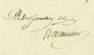 DESGENETTES Nicolas René Dufriche, baronPièce signée. Paris, 10 octobre 1808 ; 1 page in-4°. En-tête imprimé « Les Inspecteurs généraux du service de santé militaire ». Pièce signée également par Coste et Parmentier. Ils émettent un avis favorable en faveur de M. Funster, médecin requis pour l’hôpital militaire de...
