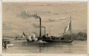 Gravure de A. Provost, représentant le catafalque sur le bateau à aube (La Dorade)