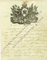 LETTRE DE SOLDAT.Lettre autographe signée du soldat Pierre Elloit Doret, du 15e régiment d’infanterie de ligne, en garnison à Brest. Brest, 17 juin 1808 ; 3 pages in-4°, adresse avec marque postale « 28/BREST ». Bel en-tête gravé d’une vignette imprimée en noir représentant l’aigle impériale au...