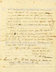 LAS CASES Emmanuel, Pons Dieudonné, comte deLettre autographe signée, adressée à un éditeur. Paris, 29 octobre [ ?] ; 2 pages in-4°. Il a trouvé à son retour à Paris le prospectus du premier volume de l’Encyclopédie des gens du monde que son correspondant lui a adressé et il lui demande de l’inscrire sur la liste des...