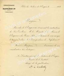 LABORDE Alexandre Louis Joseph, comte deLettre signée. « Palais des Archives de l’Empire le... 1863 » ; 1 page in-4°. En-tête imprimé « Correspondance de Napoléon Ier ».« Par ordre de l’Empereur et suivant les instructions de Son Excellence M. le Ministre de la Maison de l’Empereur […], j’ai l’honneur de vous...