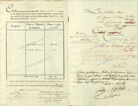 ISABEY Jean-BaptistePièce signée. Paris, 6 janvier 1811 ; 2 pages in-folio. Il s’agit d’un état concernant les travaux de menuiserie et les honoraires s’y rattachant, pour la salle des spectacles des Tuileries. Ces honoraires sont à verser à M. Bouillet, menuisier. Le document est également signé par MM....