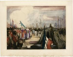 Gravure début XXe siècle à leau forte représentant la remise des cendres de Napoléon aux marins de la Belle-Poule