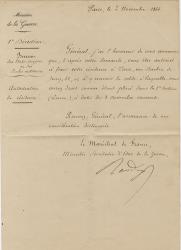 RANDON Jacques Louis César AlexandreLettre signée, adressée à Charles Chalon. Paris, 2 novembre 1866 ; 1 page in-folio. En-tête imprimé « Ministère de la Guerre ». Il lui annonce « que, d'après votre demande, vous êtes autorisé à fixer votre résidence à Paris, rue Barbet de Jouy, 42, et à y recevoir la solde à...