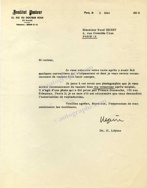 Lettre signéeLettre signée, adressée au journaliste René Brest. Paris, 6 mai 1958 ; 1 page in-4°. En-tête de l’Institut Pasteur.« Je vous retourne votre texte après y avoir fait quelques corrections qui s’imposaient et dont je vous serais...