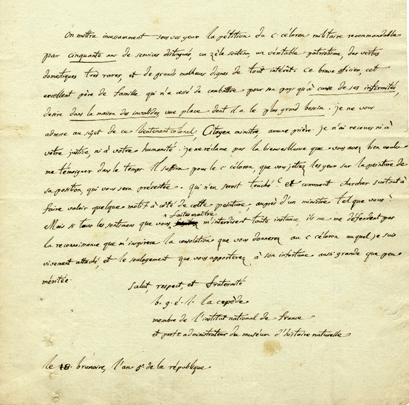 Lettre autographe signéeLettre autographe signée. 18 brumaire an V [8 novembre 1796] ; 1 page in-4°, avec adresse. « On mettra incessamment sous vos yeux la pétition du C. Célébron, militaire recommandable par cinquante ans de services distingués, un zèle...
