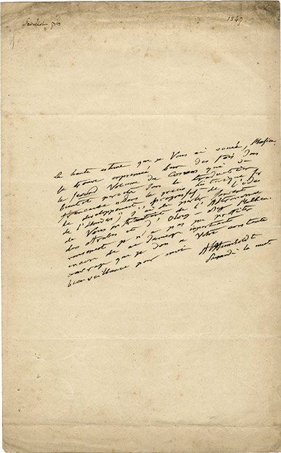 Lettre autographe signéeLettre autographe signée [adressée à M. Sédillot]. Sans date ; 1/2 page in-8°. « La haute estime que je vous ai vouée, Monsieur, se trouve exprimée bien des fois dans le second volume du Cosmos qui va bientôt paraître dans la...