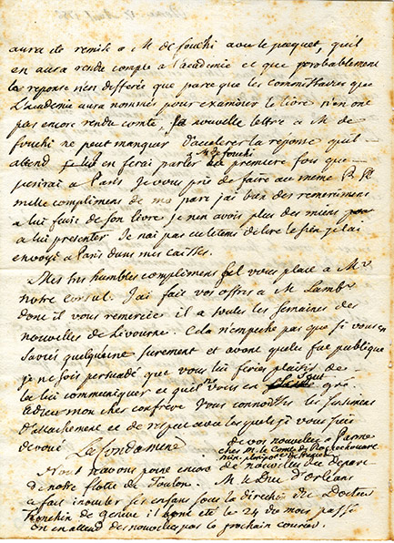 Lettre autographe signéeLettre autographe signée, adressée à labbé Venuti. Rome, 17 avril 1756 ; 2 pages in-4°, adresse au dos avec cachet de cire rouge. Labbé Venuti désire sétablir en France, mais il doit pour cela présenter un mémoire résumant...