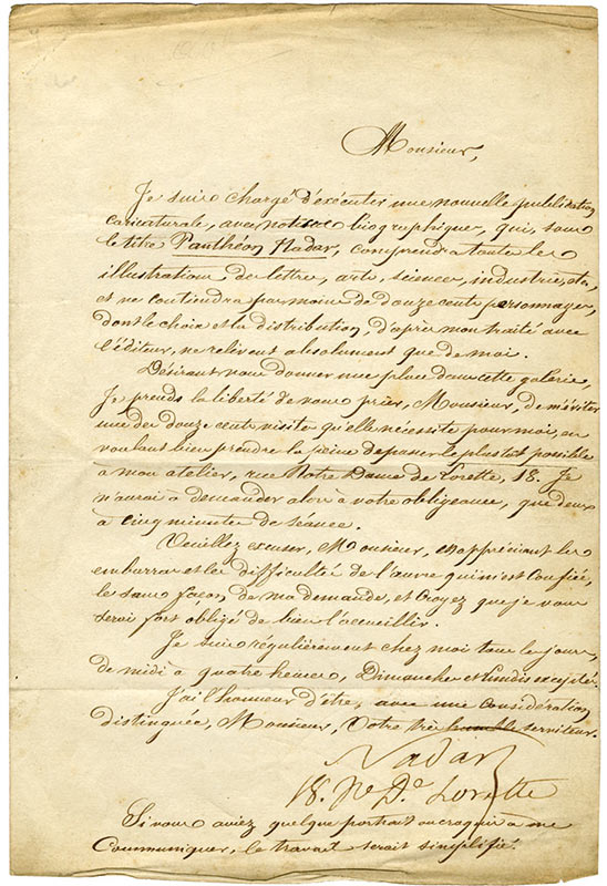 Lettre signéeLettre signée. Sans date ; 1 page in-8°. « Je suis chargé d’exécuter une nouvelle publication caricaturale, avec notices biographiques, qui, sous le titre Panthéon Nadar, comprendra toutes les illustrations des lettres, arts,...