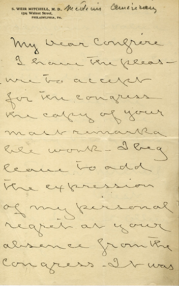 Lettre autographe signéeLettre autographe signée, adressée à un confrère. 30 septembre 1891 ; 2 pages in-8°, en anglais. Papier à en-tête imprimé à son nom. « I have the pleasure to accept for the Congress the copy of your remarkable work. » Rare.