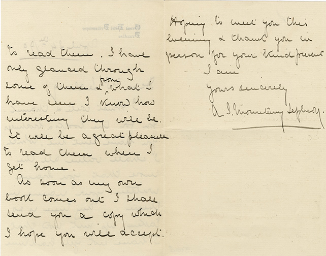 Lettre autographe signéeLettre autographe signée, adressée à Jules Leclercq à Bruxelles. Bruxelles, 24 avril 1890 ; 2 pages 1/2 in-12, en anglais. En-tête du « Grand Hôtel Britannique ». Il le remercie pour les livres et revues reçus et promet de les...
