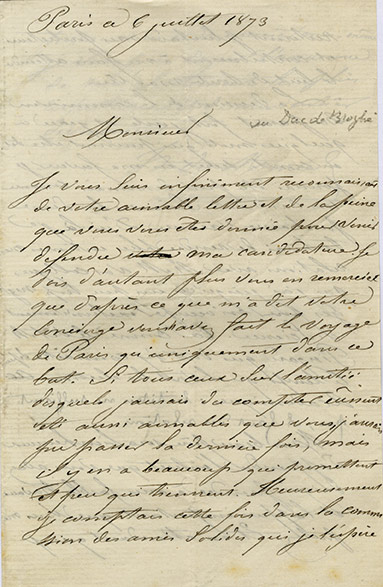 Lettre autographe signéeLettre autographe signée. Paris, 1er juillet 1873 ; 6 pages in-8°. « L’Académie vient de nous nommer, à ma grande satisfaction, membre de la commission appelée à dresser une liste de candidats pour la place d’académicien libre...