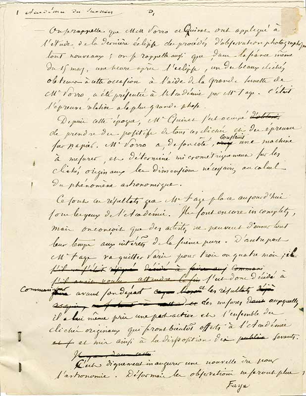 Manuscrit autographeManuscrit autographe. 5 pages in-4°. Communication faite à l’Académie des sciences sur les travaux de M. Sage. Il est question d’astronomie, d’applications de procédés photographiques à la dernière éclipse. « Un des beaux...