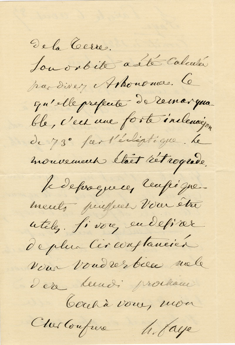 Lettre autographe signéeLettre autographe signée, adressée à un confrère. Paris, le 6 août 1887; 2 pages in-8°. « La comète de 1821 a été découverte le 21 janvier à Paris. À ce moment cet astre n’avait rien de bien remarquable. Mais en février...