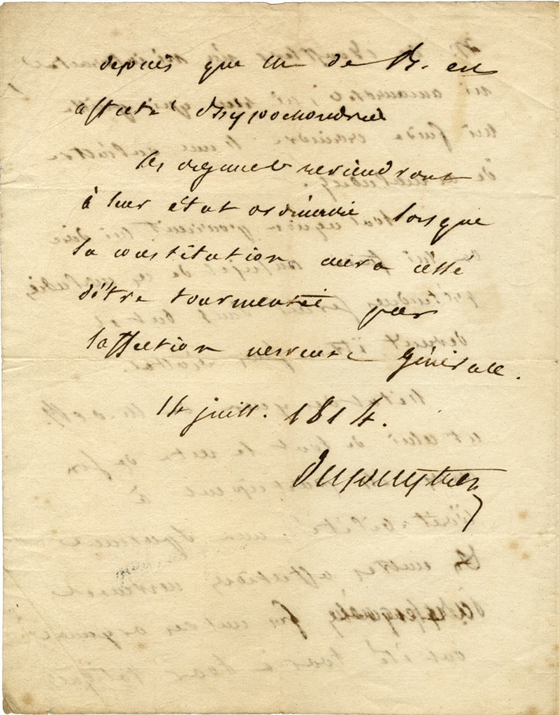 Pièce autographe signéePièce autographe signée. 14 juillet 1814 ; 2 pages in-4°. Il s’agit d’un bilan de santé du vieux chevalier de Boufflers qui devait décéder l’année suivante. « M. de Boufflers n’a […] rien qui puisse lui faire craindre...