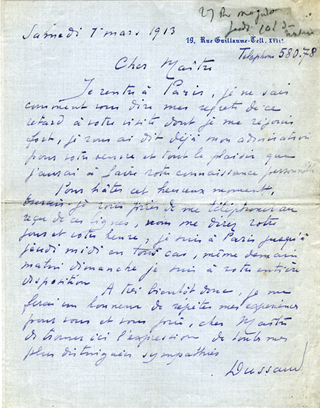 Lettre autographe signéeLettre autographe signée. Samedi 1er mars 1913 ; 1 page in-4°. « Je rentre à Paris [ ]. Je vous ai dit déjà mon admiration pour votre uvre et tout le plaisir que jaurai à faire votre connaissance personnelle. [ ] Je me ferai...
