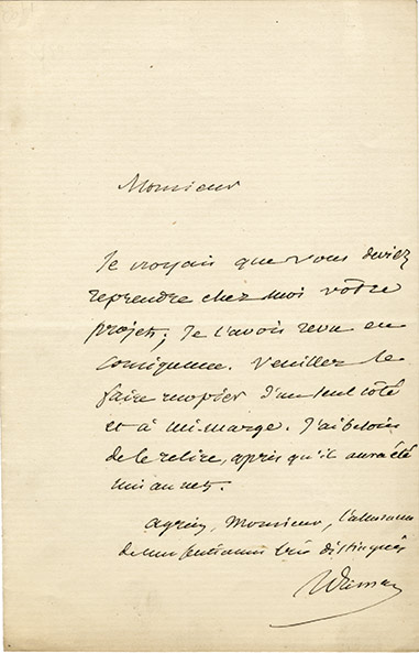 Lettre autographe signéeLettre autographe signée. Sans date ; 1 page in-8°. « Je croyais que vous deviez reprendre chez moi votre projet ; je lavois revu en conséquence. Veuillez le faire recopier dun seul côté et à mi-marge. Jai besoin de le relire,...