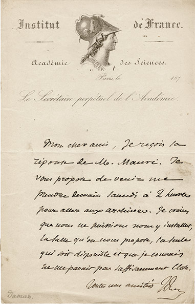 Lettre autographe signéeLettre autographe signée. Sans date 187... ; 1 page in-8°, en-tête « Institut de France Académie des Sciences ». « Je reçois la réponse de M. Mauré. Je vous propose de venir me prendre demain samedi à 2 heures pour aller aux...