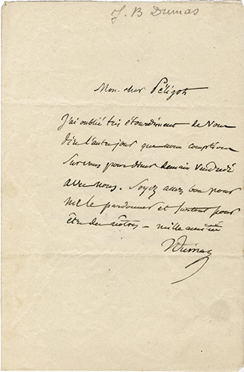 Lettre autographe signéeLettre autographe signée, adressée à M. Peligot. Sans date ; 1 page in-8°.« Jai oublié très étourdiment de vous dire lautre jour que nous comptions sur vous pour dîner demain vendredi avec nous. Soyez assez bon pour me le...