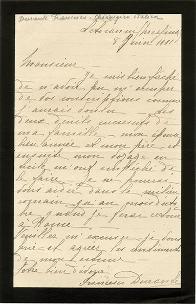 Lettre autographe signéeLettre autographe signée, adressée à un confrère. Letoianni, Messine, 8 juin 1881 ; 1 page in-8° sur papier de deuil, en français. « Je suis bien fâché de n'avoir pu m'occuper de vos souscriptions comme j'aurai voulu. Les deux...