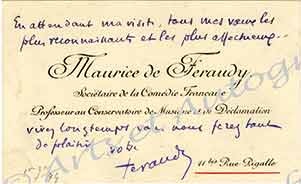 Lettre autographe signéeLettre autographe signée. 18 avril 1916 ; 1 page in-12. Il sera très heureux de faire la connaissance de son correspondant. « Votre monologue est bien fait ; le vers est facile, mais le sujet est d’un scabreux ! Nous en causerons. »