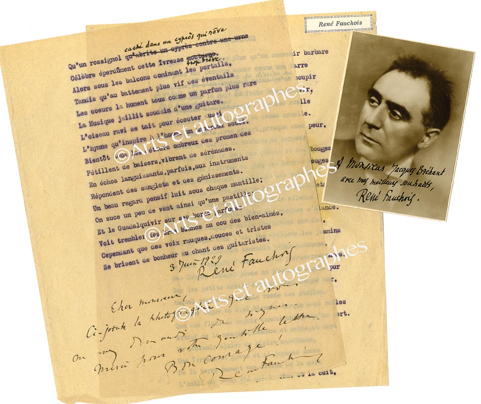 Photographie avec dédicace autographe signéePhotographie avec dédicace autographe signée, adressée à M. Bréhant. Octobre 1929 ; 87 x 120 mm. « À Monsieur Jacques Bréhant avec mes meilleurs souhaits, René Fauchois ». On joint un poème dactylographié signé (1929 ; 2 pages...