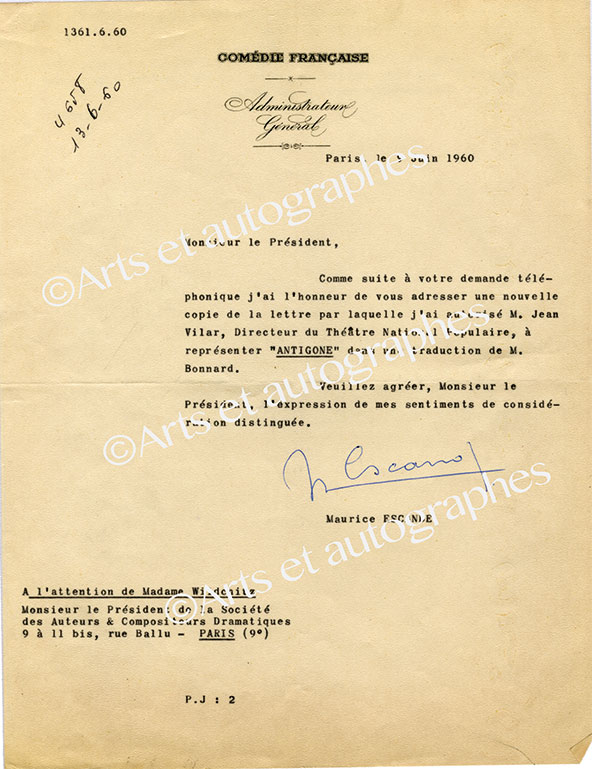 Lettre signéeLettre signée, adressée à Mme Wildschitz. Paris, 9 juin 1960 ; 1 page in-4°. En-tête de la « Comédie française — Administrateur Général ». À la suite de sa demande téléphonique, il adresse une copie de la lettre « par...