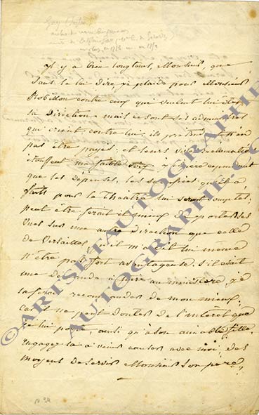 Lettre autographe signéeLettre autographe signée, adressée à M. Cabot au théâtre de Versailles. Paris, 23 décembre 1842 ; 1 page 1/2 in-8°, adresse sur le 4e feuillet. Sur la direction du théâtre de Versailles. « Je plaide pour M. Robillon contre ceux...