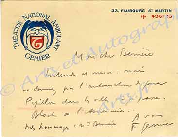 Carte autographe signéeCarte autographe signée, adressée à M. Berrière. 1 page in-16 oblongue. En-tête illustré du Théâtre national ambulant Gémier. « Ne donnez pas l’autorisation de jouer Papillon dans les villes où je passe. »