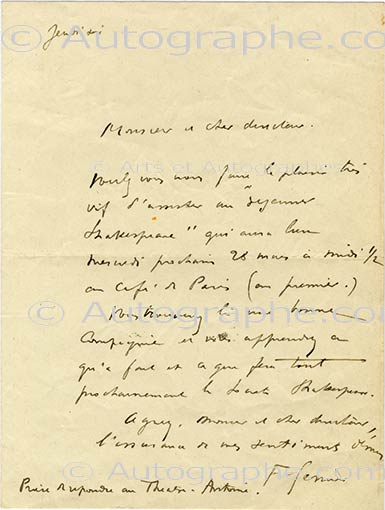 Lettre autographe signéeLettre autographe signée, adressée à un directeur. Jeudi soir ; 1 page in-12.« Voulez vous nous faire le plaisir très vif d’assister au déjeuner “Shakespeare” qui aura lieu mercredi prochain 28 mars à midi 1/2 au Café de...