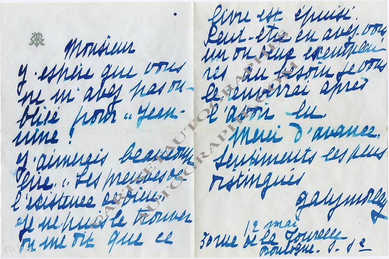 Lettre autographe signéeLettre autographe signée, adressée à M. Romilly. Boulogne-Billancourt, 12 mai [1935] ; 2 pages in-8°, enveloppe jointe. « J’aimerais beaucoup lire Les Preuves de l’existence de Dieu. Je ne puis le trouver. On me dit que ce livre...