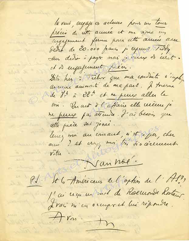 Ensemble de lettres autographes signéesEnsemble de 6 pièces signées dont 4 lettres autographes signées et 2 pièces signées, adressées à des directeurs concernant sa pièce « Teddy and Parner » pour les représentations en Italie, en Scandinavie, à Vienne, en Amérique,...