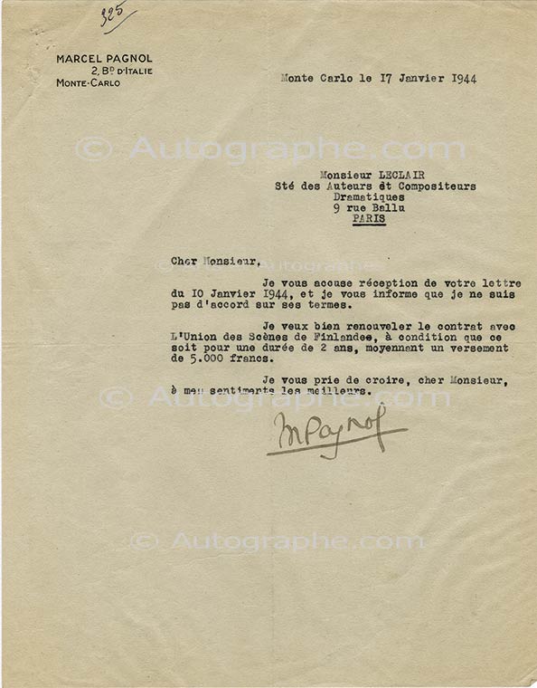 Pièce signéeLettre signée, adressée à M. Leclair. Monte Carlo, 17 janvier 1944 ; 3/4 pages in-4°. « Je vous accuse réception de votre lettre du 10 janvier 1944, et je vous informe que je ne suis pas d’accord sur ses termes. Je veux bien...
