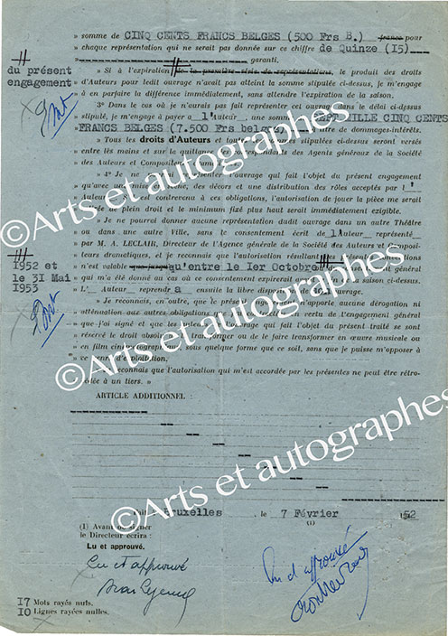 Contrat imprimé signéContrat imprimé signé. Bruxelles, 7 février 1952 ; 2 pages in-4°. « Je soussigné Oscar Lejeune Directeur du Théâtre du Parc à Bruxelles m’engage vis-à-vis de Monsieur de Montherlant auteur de la pièce en 3 actes intitulée «...