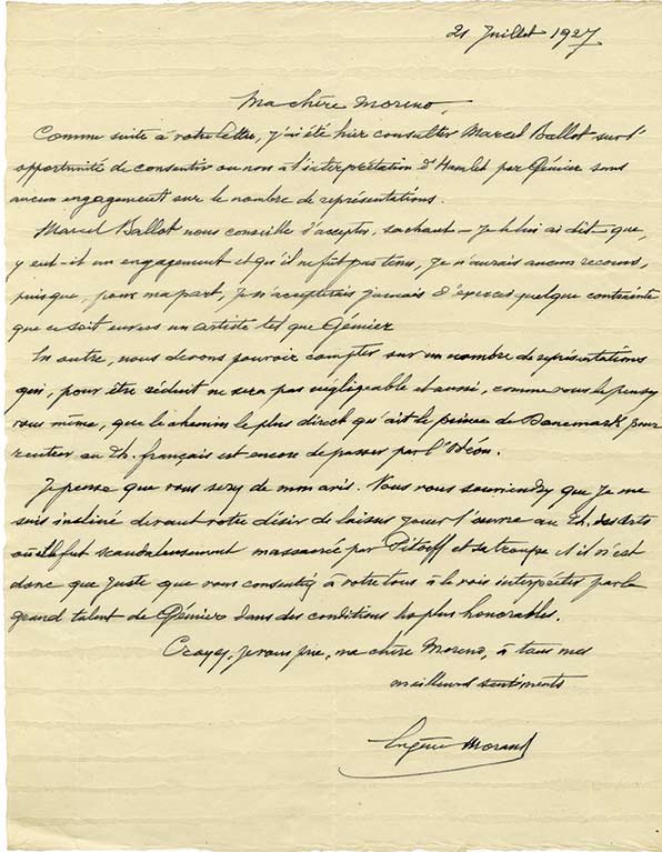 Lettre autographe signéeLettre autographe signée, adressée à « Ma Chère Moreno ». 21 juillet 1927 ; 1 page in-4°. « Comme suite à votre lettre, j’ai été hier consulter Marcel Ballot sur l’opportunité de consentir ou non l’interprétation...