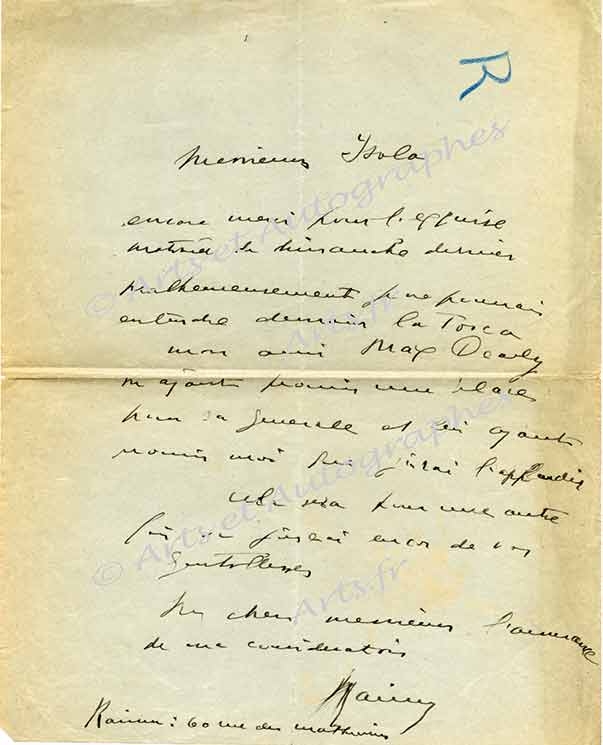 Lettre autographe signéeLettre autographe signée, adressée aux frères Isola, directeurs de théâtres parisiens. Paris, sans date ; 1 page in-4°.« Encore merci pour l’exquise matinée de dimanche dernier. Malheureusement je ne pourrais entendre demain La...