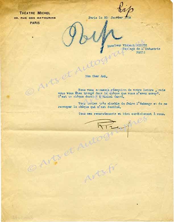 Lettre signéeLettre signée, adressée à Vincent Scotto. Paris, le 22 janvier 1924 ; 1 page in-4°, en-tête imprimé « Théâtre Michel — Paris ». « Vous vous êtes trompé dans le chèque que vous m’avez envoyé. C’est un chèque destiné à...