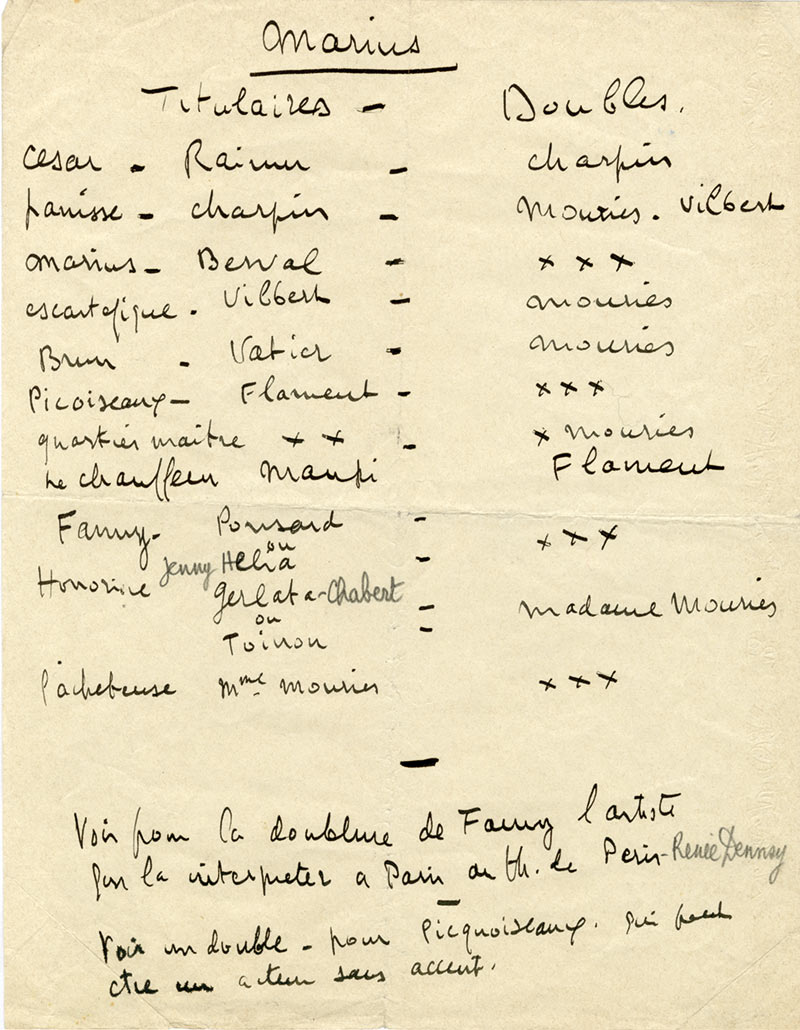 Pièce autographePièce autographe. [1931] ; 1 page in-4°.Casting proposé par Raimu pour l’adaptation cinématographique de Marius.Raimu dans le rôle de César, Charpin dans le rôle de Panisse, Berval dans le rôle de Marius, Vilbert dans...