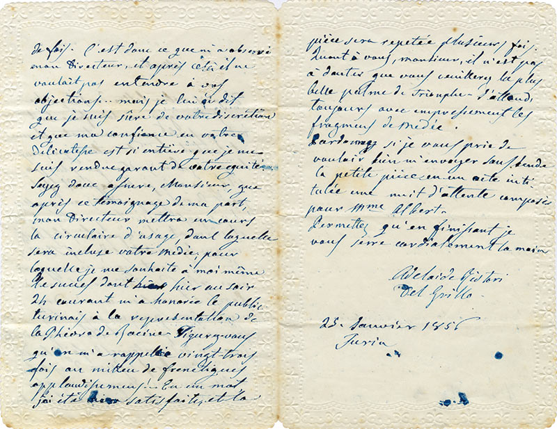 Lettre autographe signéeLettre autographe signée. Turin, 25 janvier 1856 ; 3 pages in-8°, sur un joli papier à bordures gaufrées, en français. « Les conditions de vos théâtres français n’ont aucun rapport avec celles du Théâtre italien à Paris : et...
