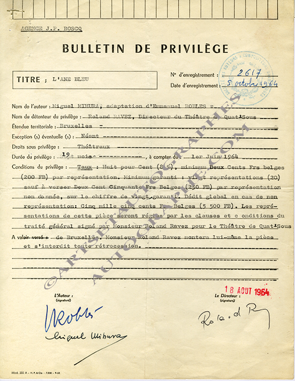 Pièce signéePièce signée. 18 août 1964 ; 1 page in-4°.Bulletin de privilège signé pour son adaptation de la pièce de Miguel Mihura , L’Âne bleu, dont on trouve aussi, la signature au bas du document.