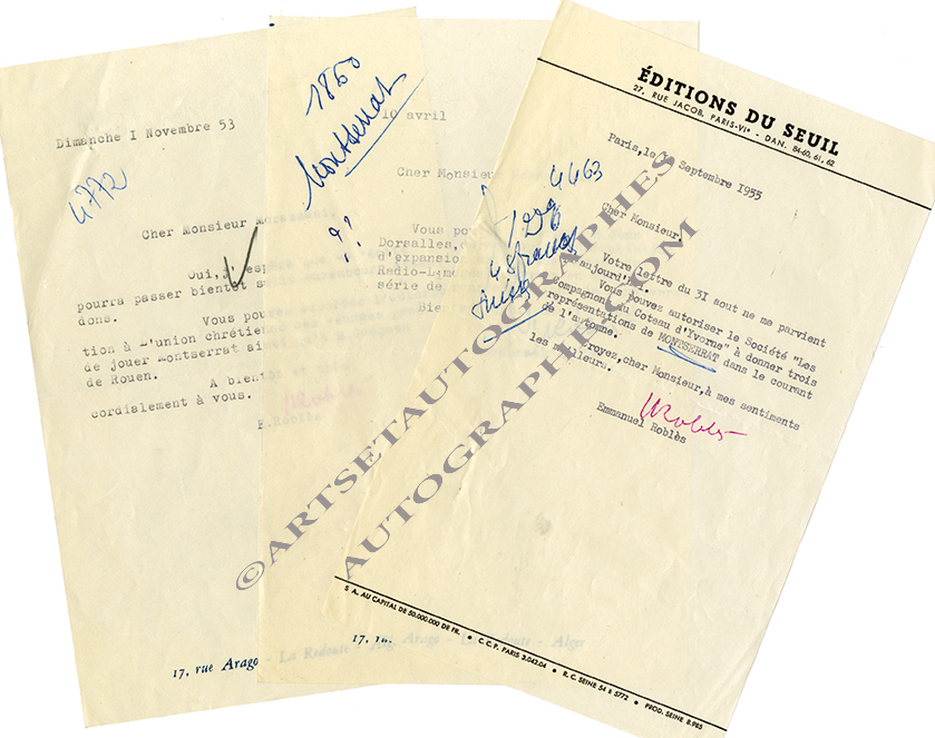 Ensemble de lettres signéesTrois lettres signées, adressées à M. Morazzani. 1953-1955 ; 1/2 page in-12, chaque. Autorisations pour les représentations de Montserrat, données à Radio-Limoges, à la Société Les Compagnons du Coteau d’Yvorne , à l’Union...