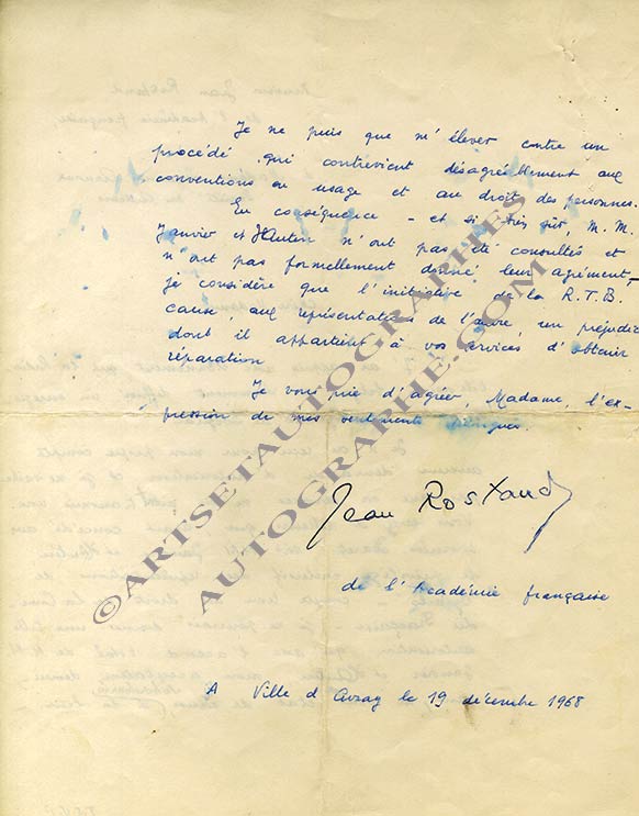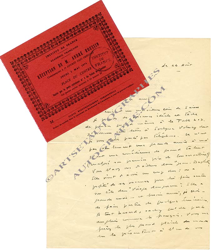 Lettre autographe signéeLettre autographe signée, adressée à Mme Suzanne Arnoux. Ville-d’Avray, 19 décembre 1935 ; 2 pages in-4°, traces de mouillures sur certains mots.« J’ai appris avec étonnement que la Radio Télévision belge a récemment diffusé...
