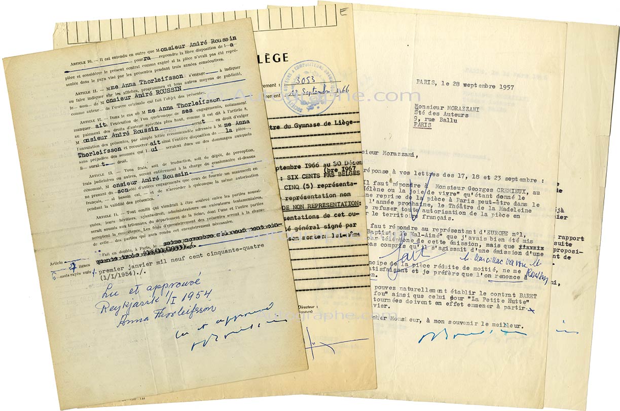 Ensemble de 4 documents signésEnsemble de 4 documents signés. 1954-1966 ; ensemble de 7 pages in-4°. Concerne la gestion de ses droits d’auteur de différentes pièces Un Amour qui n’en finit pas, Lorsque l’enfant paraît, Hélène ou la joie de Vivre, l’Amour...