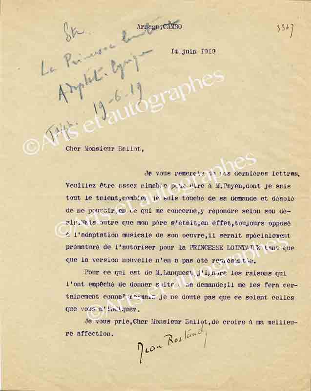 Lettre signéeLettre signée, adressée à M. Ballot. Arnaga, Cambo, 14 juin 1919 ; 1 page in-4°. « Outre que mon père s’était en effet, toujours opposé à l’adaptation musicale de son œuvre, il serait spécialement prématuré de l’autoriser...